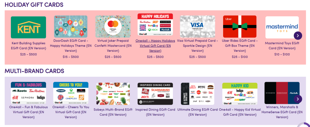 Types of gift cards available on Giftcards.ca